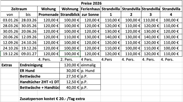 Hier finden Sie die aktuelle Preisliste für 2025. Auf Anfrage informieren wir Sie auch gerne über Sonderkonditionen. Wir vermieten Ihnen unsere Wohnung und das Ferienhaus das ganze Jahr über und vermitteln Ihnen auch andere Unterkünfte.